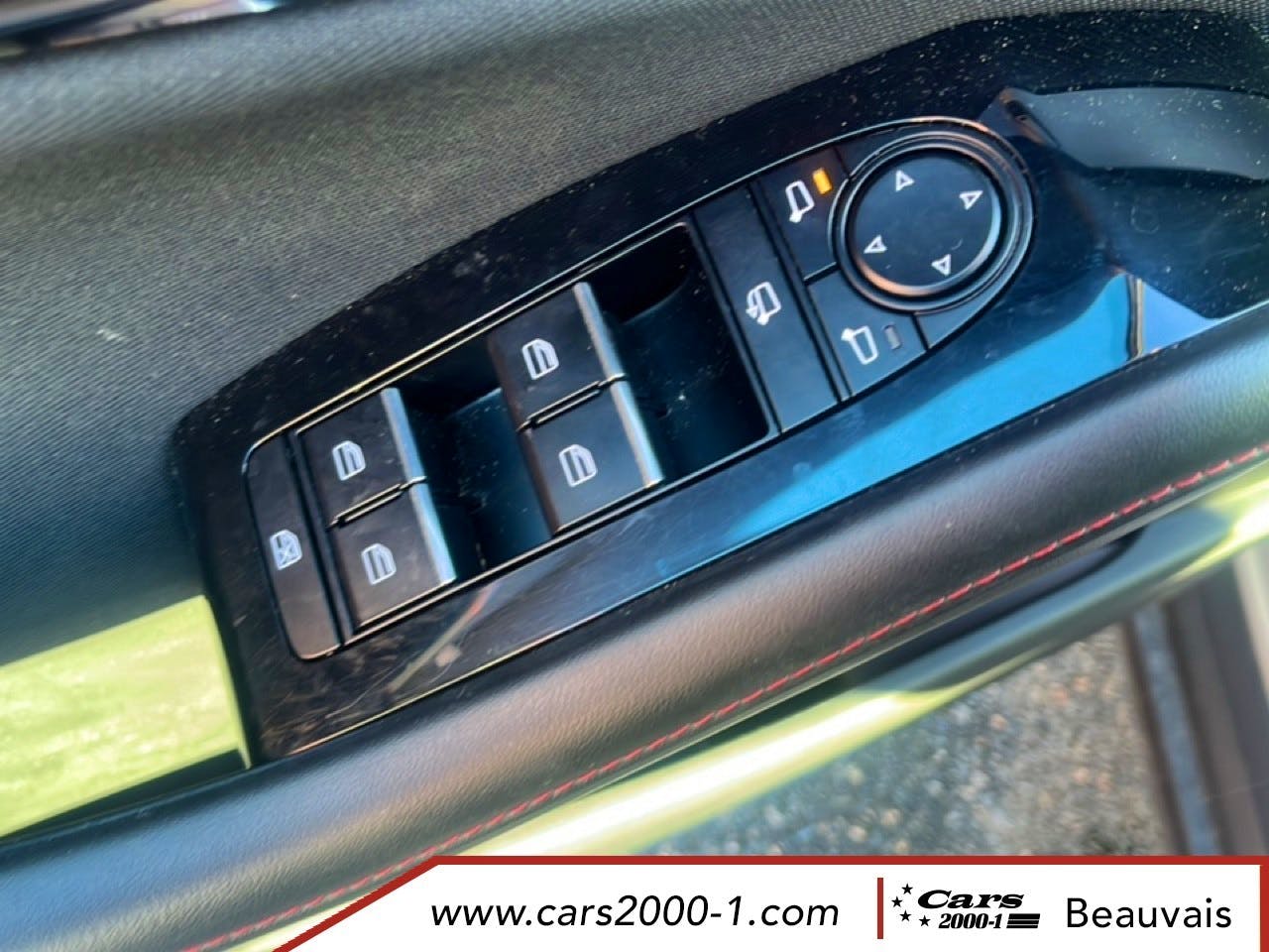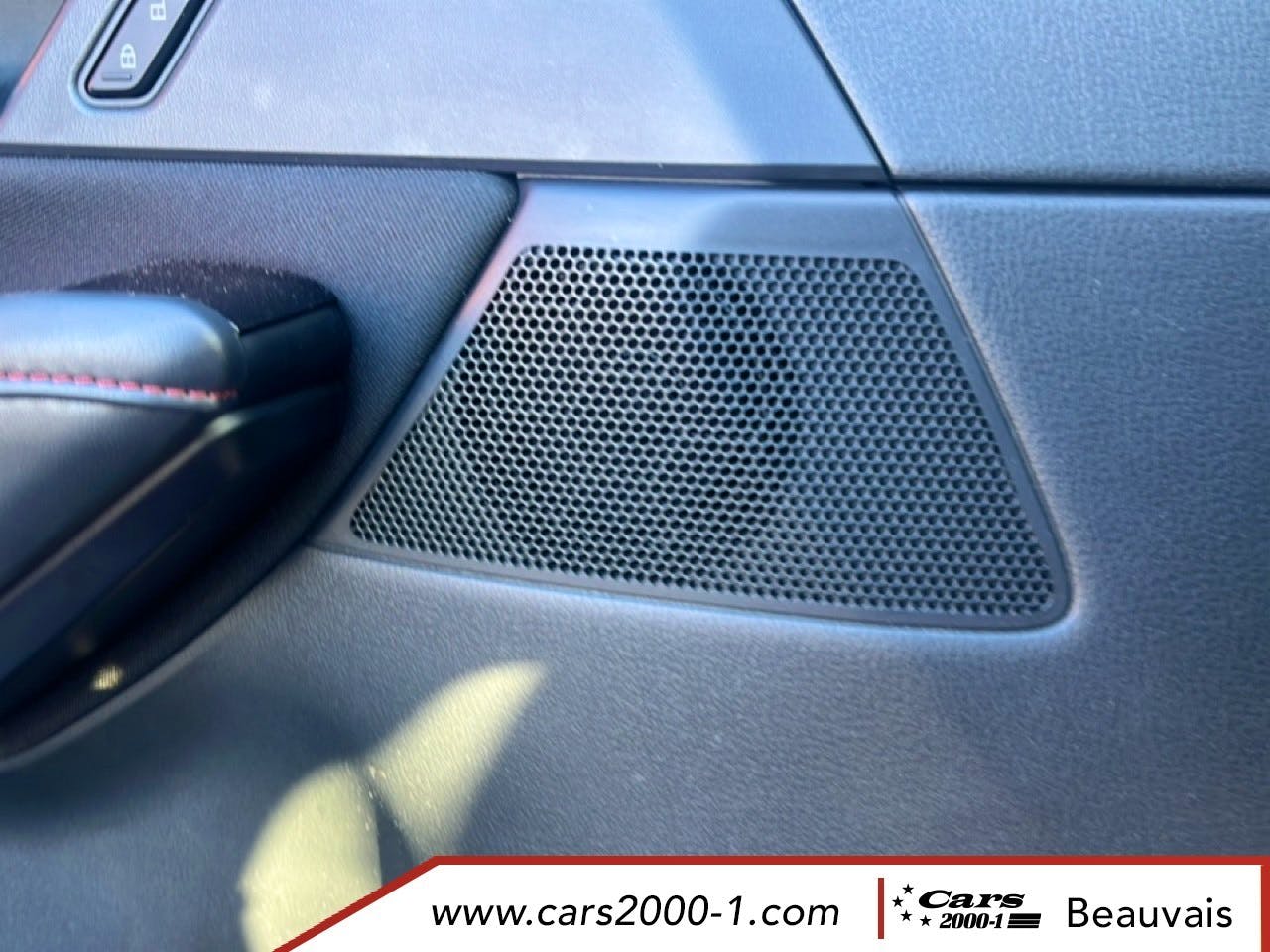 Sieges en tissu noir, tableau de bord, accoudoir, etc., avec surpiqures rouges