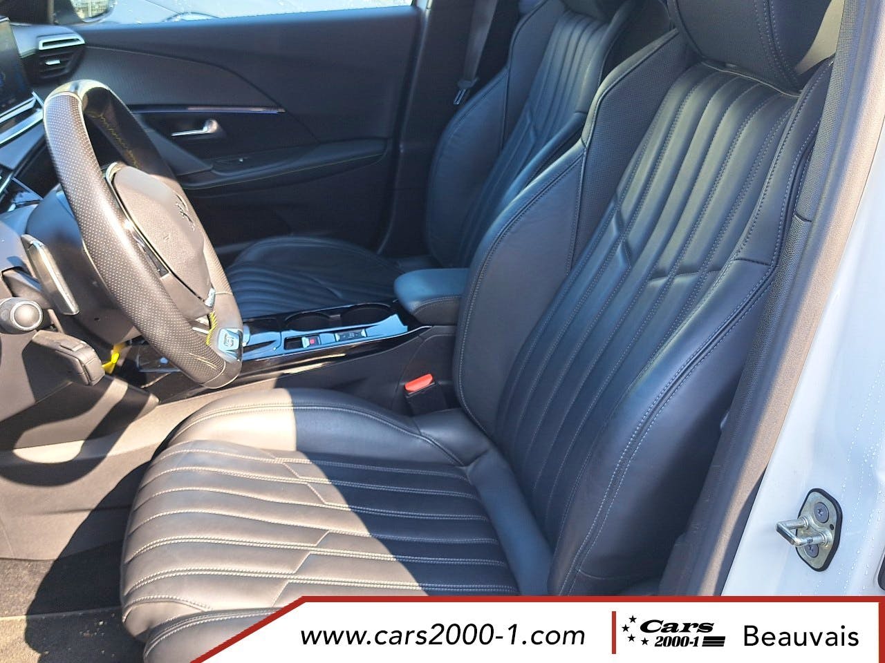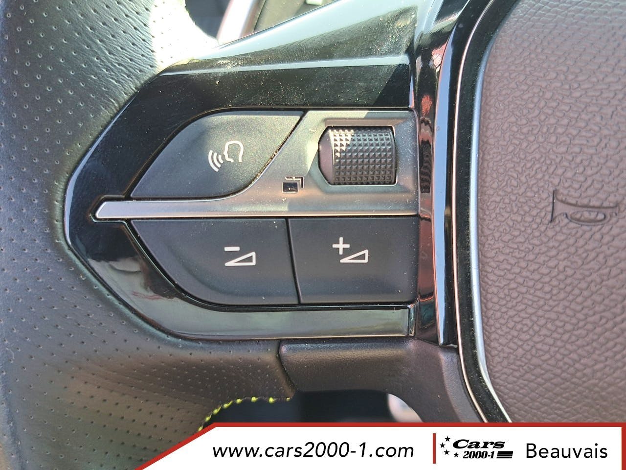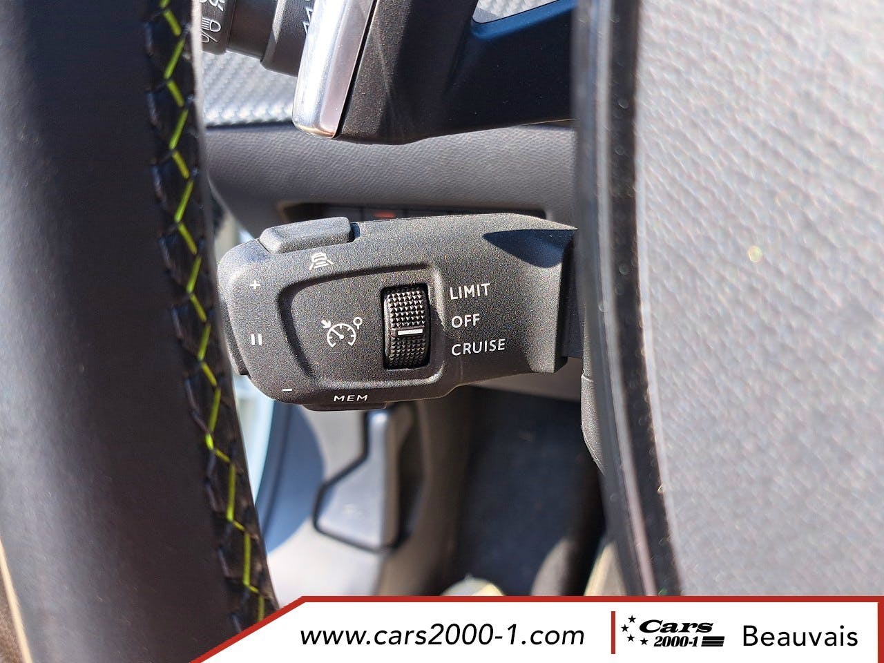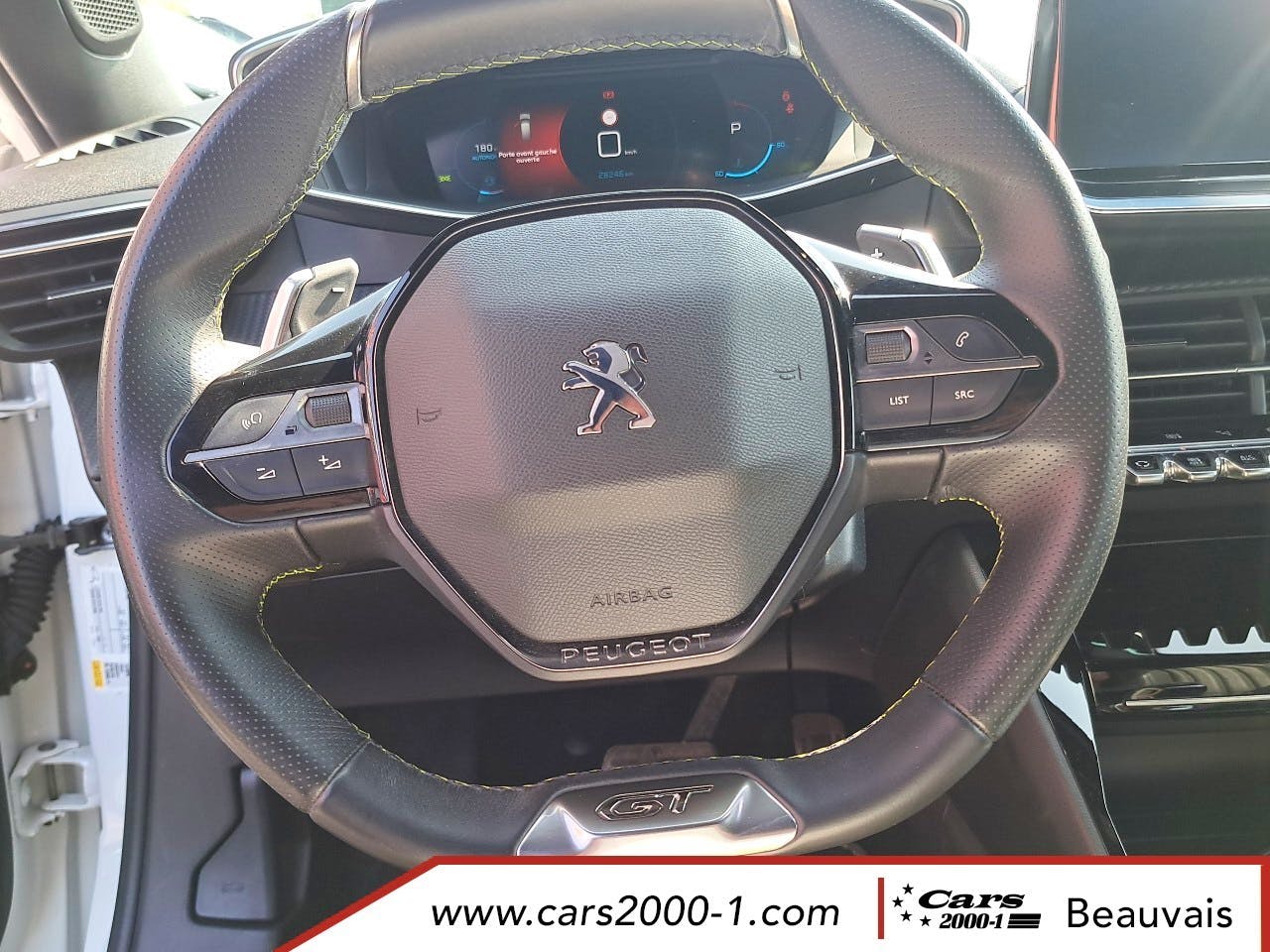 Volant compact cuir fleur avec lacage vert, Lion chrome et badge GT et commandes multimedia sur